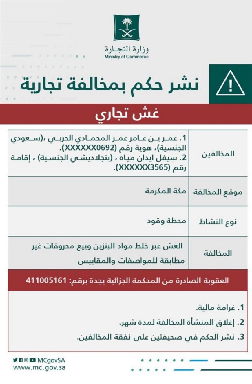 شهرت وزارة التجارة، الإثنين «19 أكتوبر 2020»، بصاحب محطة محروقات وعامل مقيم من جنسية بنجلاديشية في مكة المكرمة، بعد صدور حكم قضائي بإدانتهما بمخالفة نظام مكافحة الغش التجاري وثبوت تورط المنشأة في الغش عبر خلط مواد البنزين 91 و95 وبيع محروقات غير مطابقة للمواصفات والمقاييس.