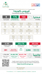 وقالت إنه تم تسجيل 175 حالة تعافٍ جديدة ليصبح الإجمالي 353179 حالة ولله الحمد.