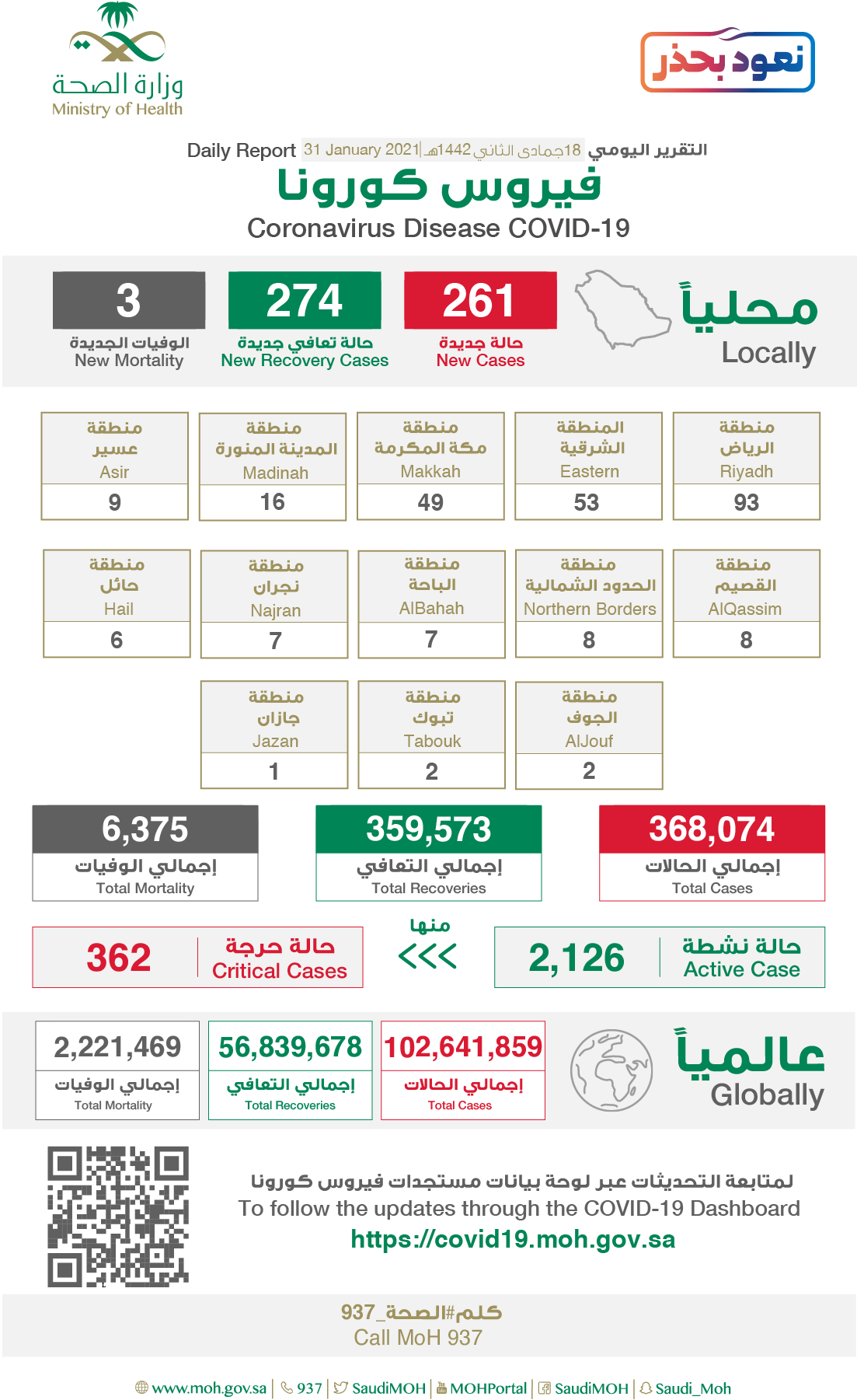 ويوضح الجدول المرفق توزيع الحالات الجديدة في مدن المملكة، وكذلك أعداد الإصابة والتعافي والوفيات عالمياً.