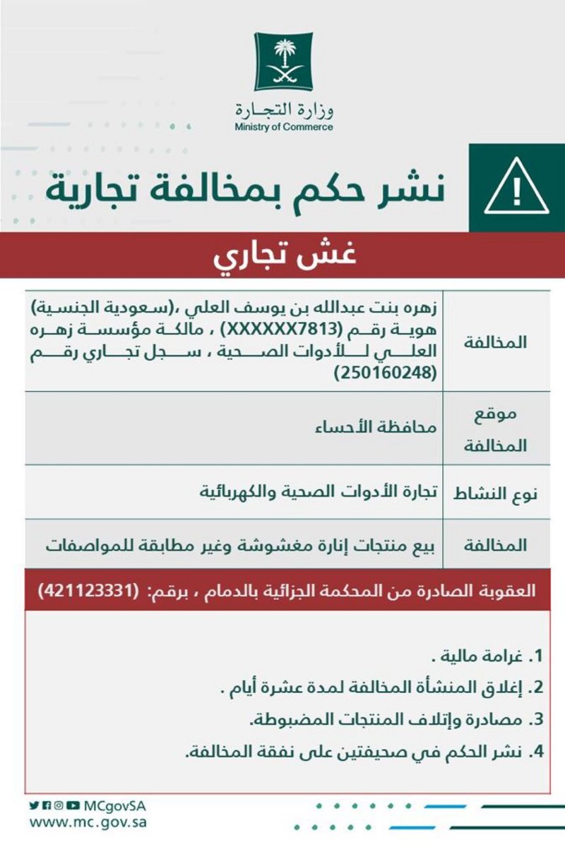 شهرت وزارة التجارة بمالكة مؤسسة تختص في تجارة الأدوات الصحية والكهربائية بمحافظة الأحساء، إثر صدور حكم قضائي بإدانتها بمخالفة نظام مكافحة الغش التجاري بعد ضبط 997 منتج إنارة مغشوشاً وغير مطابق للمواصفات القياسية المعتمدة معروضة للبيع.