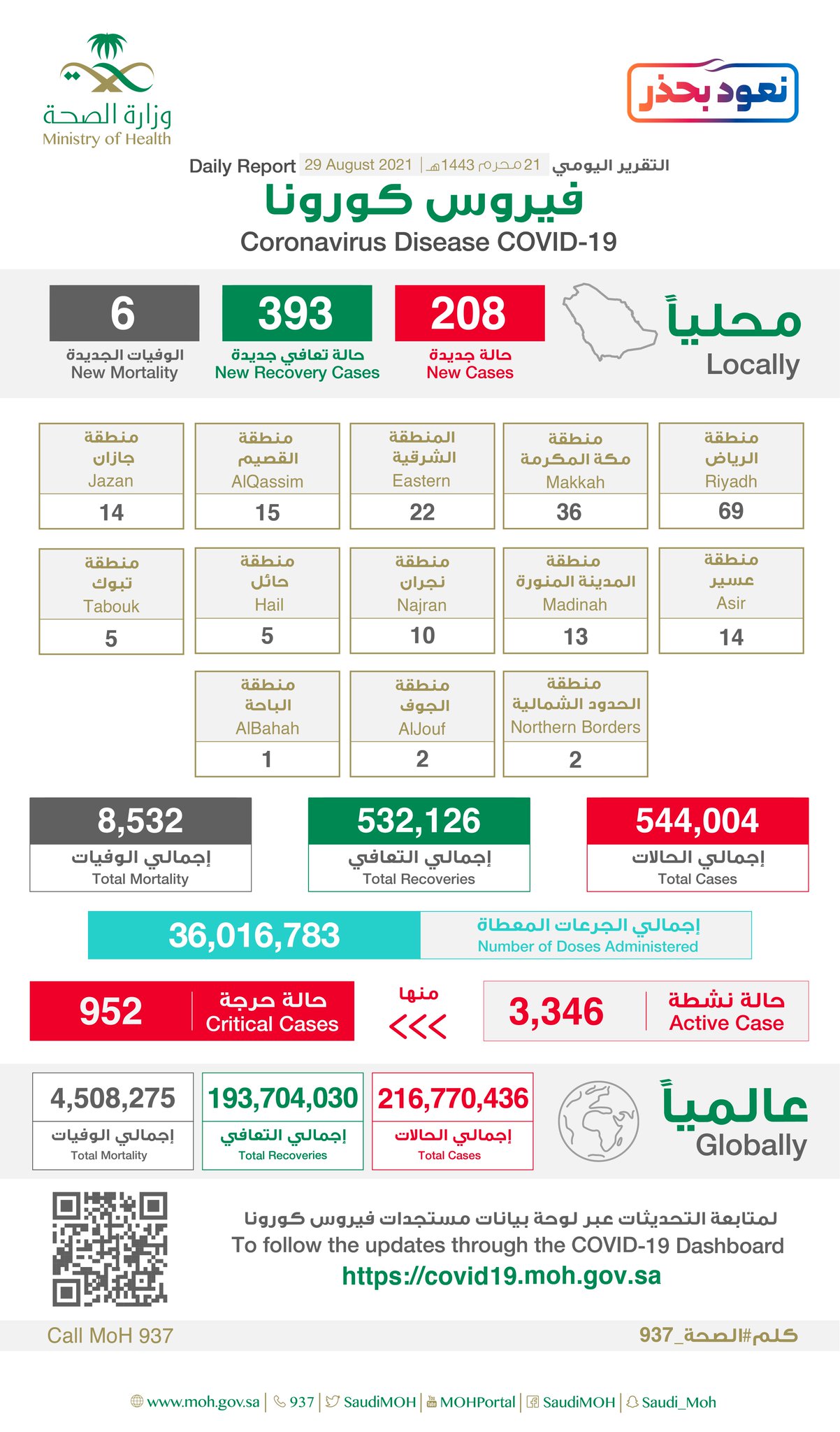 وذكرت الوزارة أن عدد الحالات النشطة 3346 منها 952 حالة حرجة، فيما بلغ إجمالي الجرعات المعطاة 36,016,783.