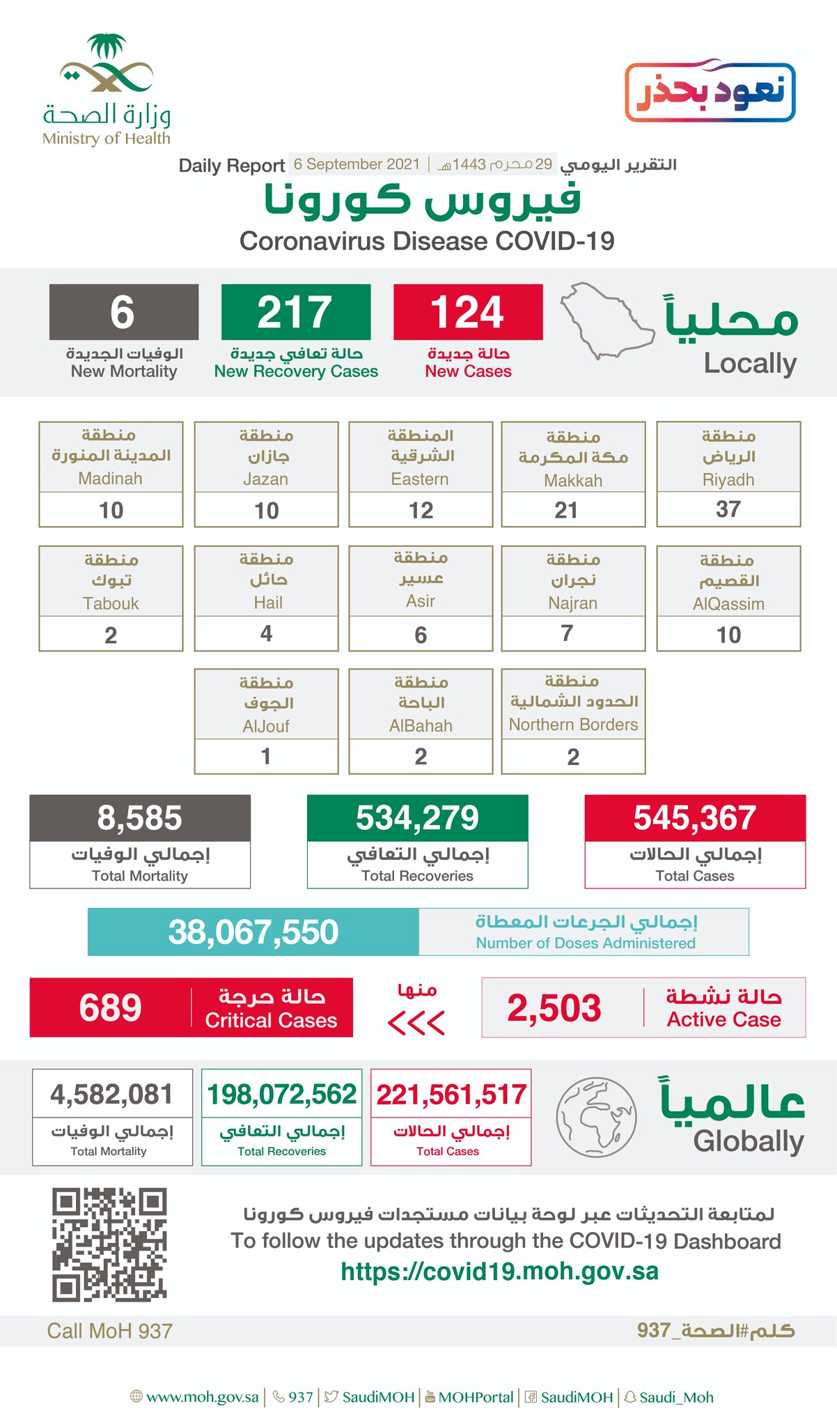 وبينت الإحصائية أن إجمالي عدد الإصابات في المملكة بلغ (545367) حالة ، كما بلغ عدد حالات التعافي (534279) حالة، وفيما يخص الوفيات فقد تم تسجيل (6) حالات ليصل إجمالي عدد الوفيات في المملكة (8585) حالة “يرحمهم الله جميعاً” .