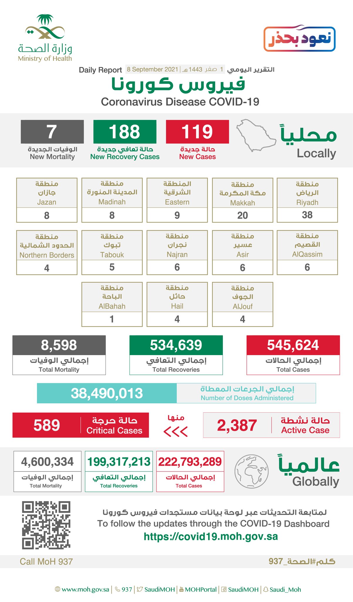 وبينت الإحصائية أن إجمالي عدد الإصابات في المملكة بلغ (545624) حالة ، كما بلغ عدد حالات التعافي (534639) حالة، وفيما يخص الوفيات فقد تم تسجيل (7) حالات ليصل إجمالي عدد الوفيات في المملكة (8598) حالة “يرحمهم الله جميعاً” .