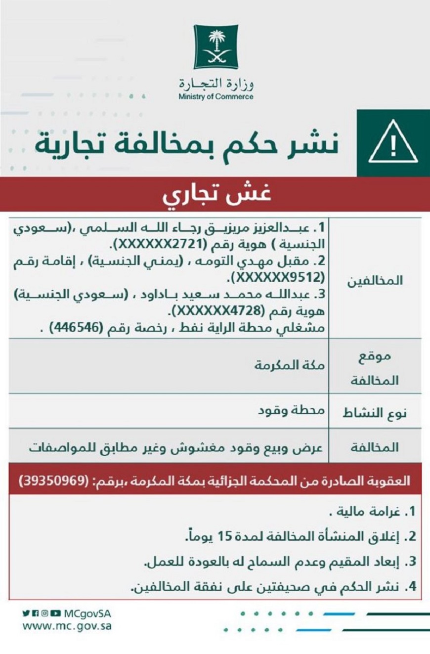 شهرت وزارة التجارة، الأربعاء «15 سبتمبر 2021»، بثلاثة من مشغلي محطة وقود بمكة المكرمة، مواطنان سعوديان ومقيم من جنسية يمنية بعد صدور حكم قضائي بإدانتهم بمخالفة نظام مكافحة الغش التجاري إثر تورط المنشأة في عرض وبيع وقود مغشوش وغير مطابق للمواصفات.