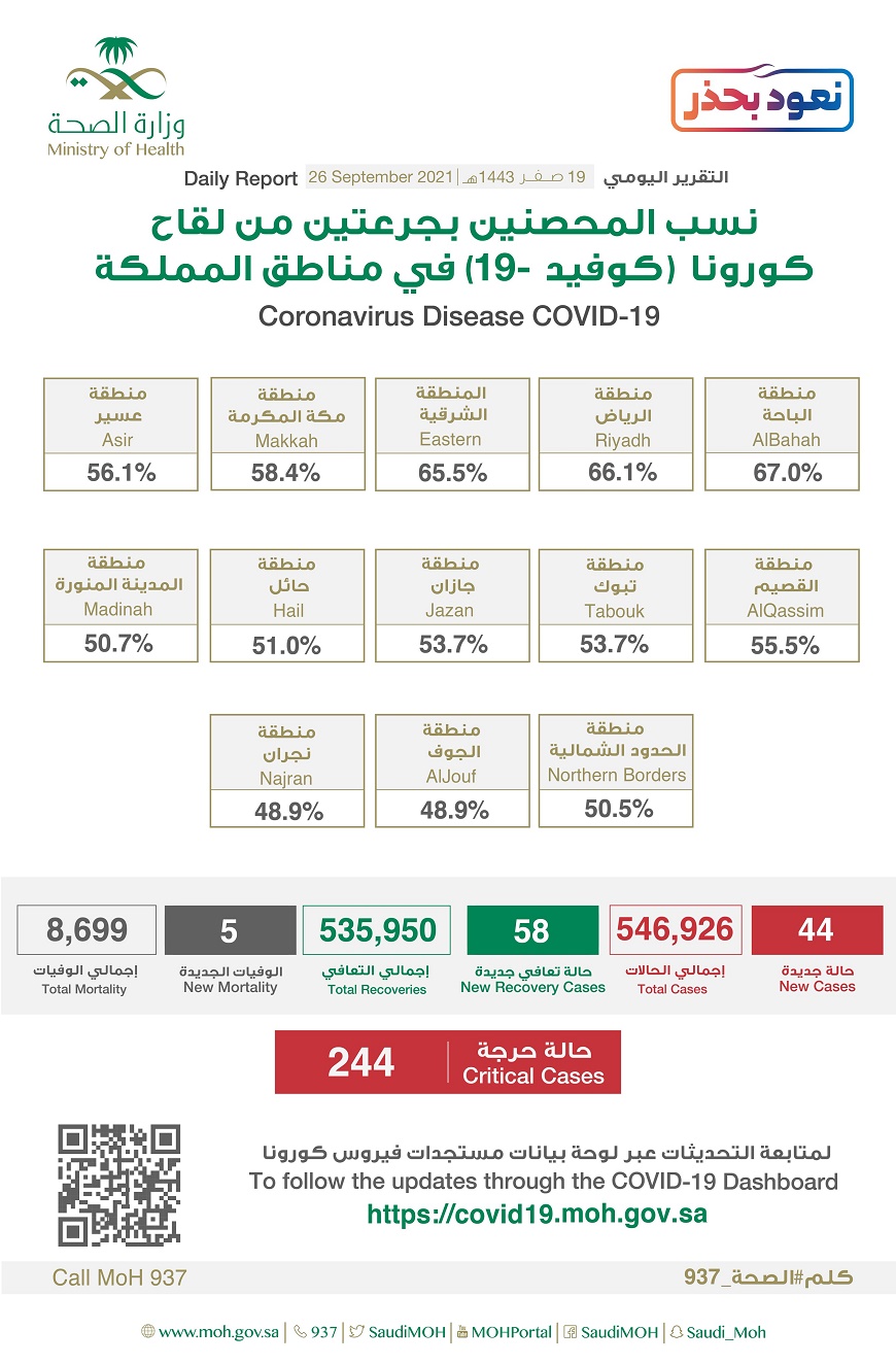 إلى ذلك، أعلنت الصحة، الأحد «26 سبتمبر 2021»، إحصائية جديدة لمستجدات كورونا في المملكة خلال الـ24 ساعة الماضية تضمنت تسجيل (44) حالة مؤكدة وتعافي (58) حالة فيما بلغ عدد الحالات الحرجة (244) حالة.