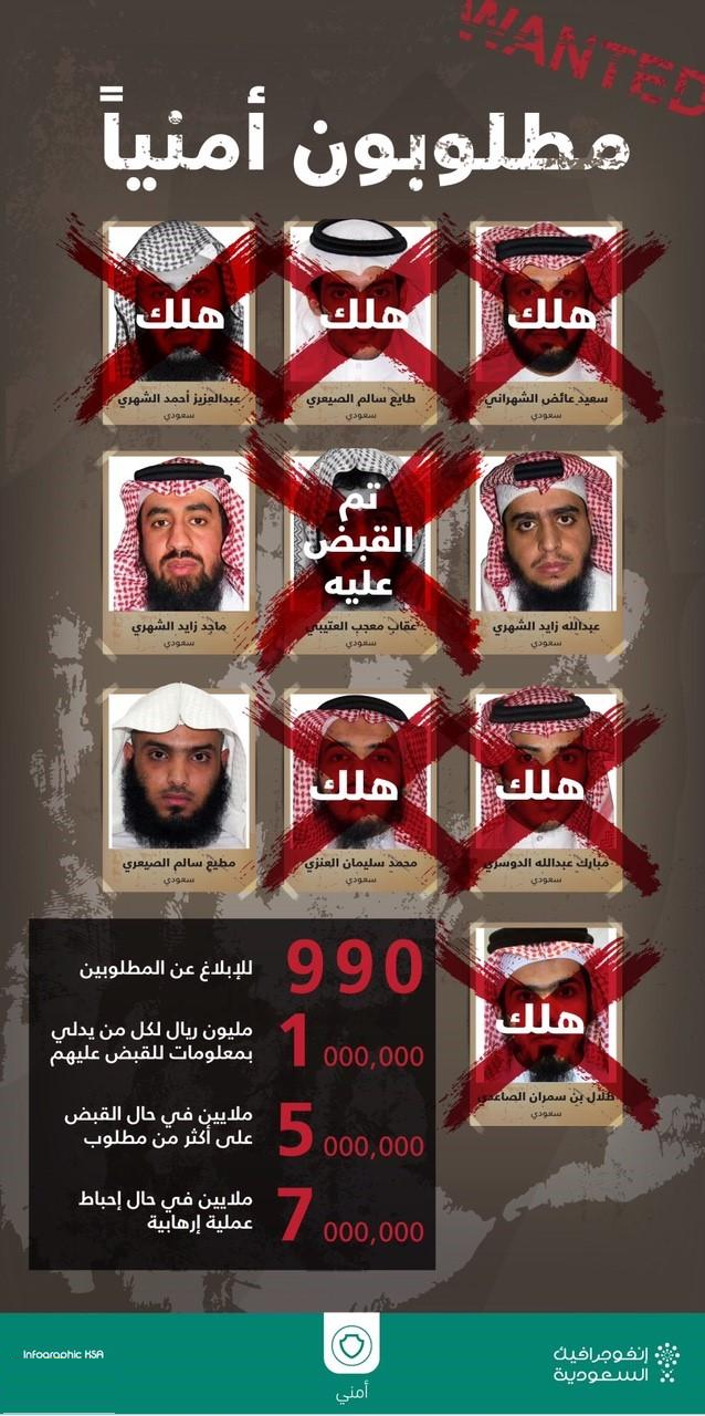 رصدت وزارة الداخلية مبلغ مليون ريال مكافأة لمن يدلي بمعلومات عن ماجد زايد الشهري، ومطيع سالم الصغيري، وعبد الله زايد الشهري، الثلاثة المتبقين في قائمة الإرهابيين العشرة.