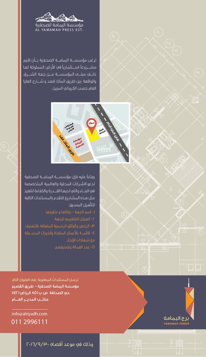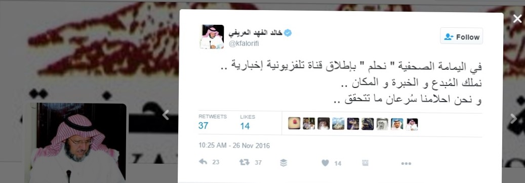 ربما هي تغريدة بـ 39 حرفا لم تحتج إلى كل الـ 140 حرفا، لكنها كانت شاهدا على شرارة الثورة وبداية التغيير وبرنامج التحول في مؤسسة اليمامة الصحفية، فقبل ستة أشهر تقريبا وتحديدا في 5 يونيو 2016 وبعد أيام قليلة من دخوله عالم (تويتر) بدأ خالد الفهد العريفي المدير العام لمؤسسة اليمامة الصحفية التغريد بجملة قصيرة اختصر فيها أفكار وطموحات ومشاريع المؤسسة في العالم الجديد كتب فها: “اليمامة الصحفية ليست جريدة ومجلة فقط”، ليكشف من بعدها وعبر العديد من التغريدات عن كل جديد ينقل المؤسسة من عالم التحرير الصحفي المجرد إلى عالم الأعمال والاستثمار، ومن عمليات البحث عن موارد مالية جديدة كمشروع بناء برج وإطلاق جريدة إعلانية جديدة إلى قرارات تخفيض المصروفات بما في ذلك تغيير نظام الإضاءة داخل مبنى المؤسسة بهدف الترشيد.