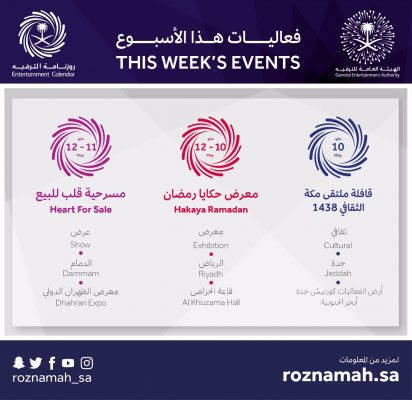وفي جانبٍ آخر، تقام العديد من الفعاليات الشاملة خلال عطلة نهاية هذا الأسبوع في عدد من مناطق المملكة ، ففي الدمام تقام عروض المسرحية الكوميدية “قلب للبيع” ، وذلك في الفترة من 11 وحتى 13 مايو 2017 بمعرض الظهران الدولي. وفي الرياض يقام المعرض النسائي “حكايا رمضان” وهو معرض يهتم بالعديد من الفعاليات الرمضانية و لوازم الشهر الفضيل وذلك بالفترة من 10 وحتى 12 مايو 2017 في قاعة الخزامى بطريق الملك خالد علماً بأن هذه الفعالية مجانية.