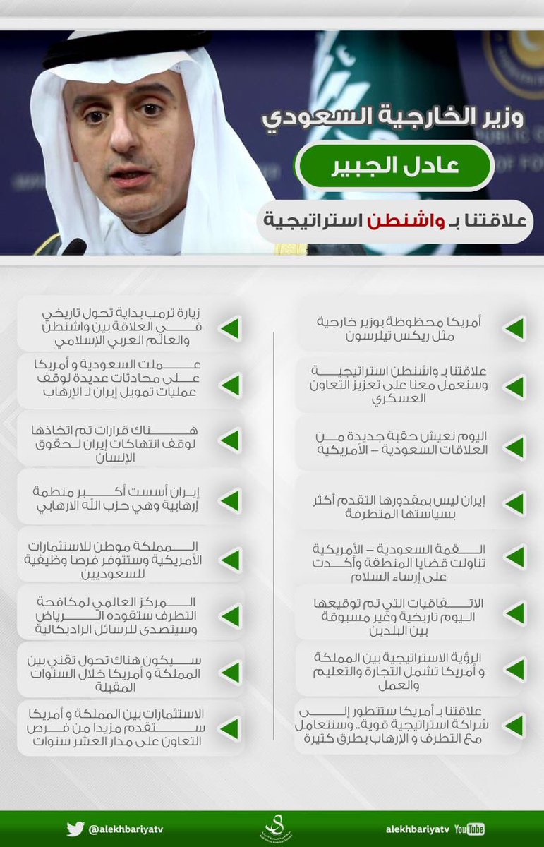 أكّد وزير الخارجية عادل الجبير، اليوم السبت الموافق 20/5/2017م، أن العلاقات بين واشنطن والرياض استراتيجية، وستتطوّر إلى شراكة استراتيجية، مع العمل على تعزيز التعاون العسكري، مُعتبراً الاتفاقيات التي جرى توقيعها اليوم تاريخية وغير مسبوقة بين البلدين.