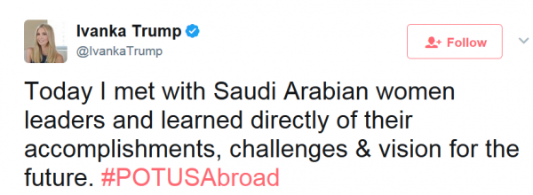 استمرّت ومنذ وصولها للمملكة بصحبة الرئيس الأمريكي دونالد ترمب، “إيفانكا ترامب” في نشر تغريدات عبّرت فيها عن سعادتها بزيارة المملكة، والتي آخرها ما نشرته الأحد 21/5/2017م بعد لقائها قيادات نسائية سعودية.