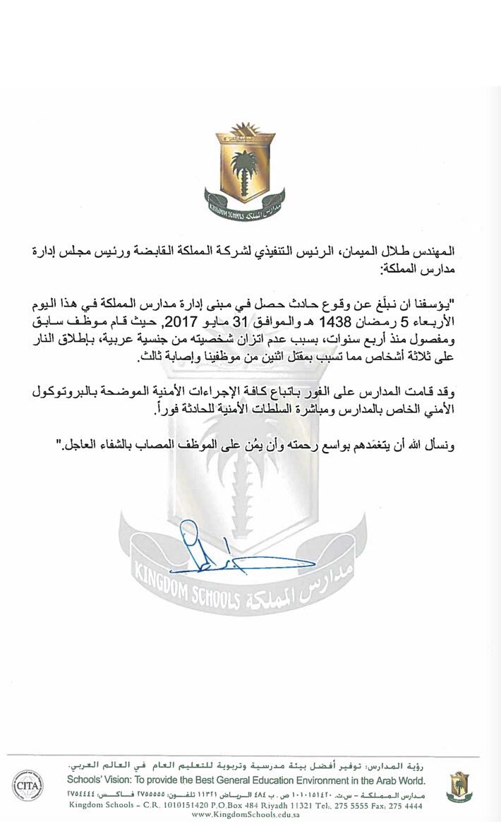 وقال الرئيس التنفيذي لشركة المملكة القابضة ورئيس مجلس إدارة مدارس المملكة المهندس طلال الميمان، في بيان نشره على حساب المدارس بـ(تويتر) : “يؤسفنا أن نبلغ عن وقوع حادث حصل في مبنى إدارة مدارس المملكة في هذا اليوم الأربعاء، حيث قام موظف عربي سابق ومفصول منذ 4 سنوات بسبب عدم اتزان شخصيته بإطلاق النار على 3 أشخاص ما تسبب في مقتل اثنين من موظفينا وإصابة ثالث”.