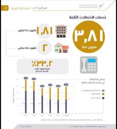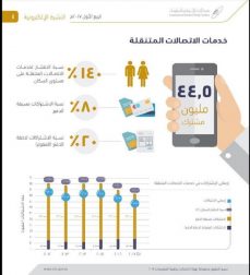 وتضمنت النشرة عدد الاشتراكات في خدمات الاتصالات المتنقلة التي بلغت حوالي 44.5 مليون اشتراك، وعدد الخطوط العاملة للهاتف الثابت والتي بلغت حوالي 3.81 مليون خط.