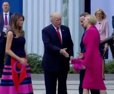 وتُظهر لقطات الفيديو مصافحة الرئيس ترامب لنظيره دودا قبل أن يستدير إلى سيدة بولندا الأولى، ولكن عندما مدَّ يده لمصافحتها تجاوزته لتصافح زوجته ميلانيا بدلاً منه.