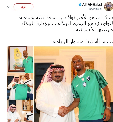 فى أول تعليق له بعد انتقال للهلال لموسمين مقبلين ، قال الحارس العماني المخضرم علي الحبسي، فى تغريدة عبر حسابه الرسمي في موقع التواصل الاجتماعي “تويتر” : “بسم الله نبدأ مشوار الزعامة” ، مضيفا : “شكراً سمو الأمير نواف بن سعد ثقته وسعيه لتواجدي مع الزعيم الهلالي، ولإدارة الهلال مهنيتها الاحترافية.