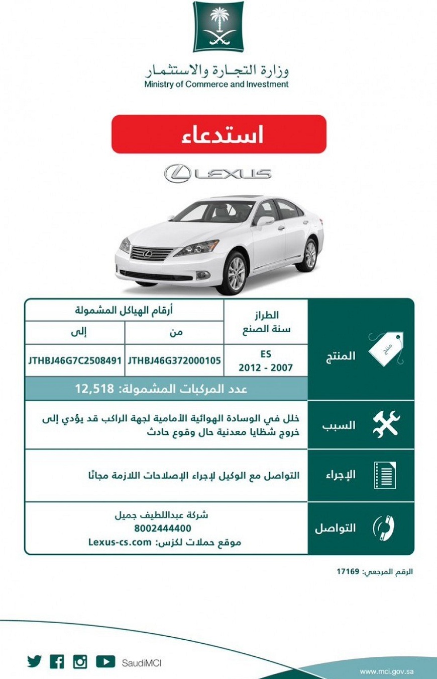 أعلنت وزارة التجارة والاستثمار اليوم الاثنين (31 يوليو 2017م)، عن استدعاء 12,518 مركبة من نوع لكزس طراز (ES) من سنة الصنع 2007 وحتى سنة 2012م.
