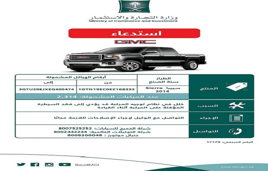 استدعت وزارة التجارة والاستثمار، اليوم الاثنين (14 أغسطس 2017م)، 3549 مركبة من طراز (GMC سييرا وChevrolet سيلفرادو).
