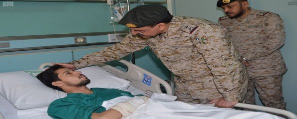 ونقل العلويط خلال زيارته للمصابين تحيات وتقدير خادم الحرمين الشريفين الملك سلمان بن عبدالعزيز القائد الأعلى لكافة القوات العسكرية وولي العهد نائب رئيس مجلس الوزراء ووزير الدفاع الأمير محمد بن سلمان بن عبدالعزيز، كما اطمأن على حالتهم الصحية.