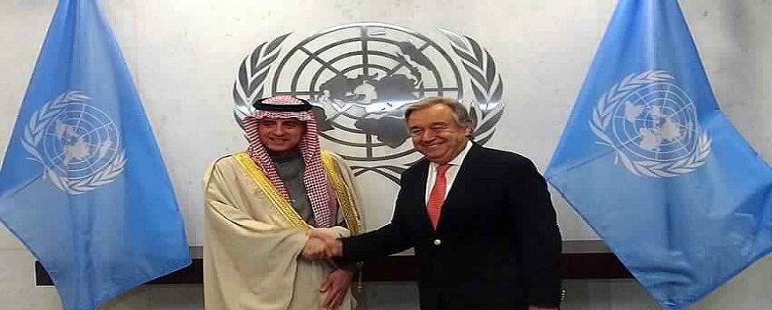 التقى وزير الخارجية عادل بن أحمد الجبير في مقر الأمم المتحدة في نيويورك الأمين العام للأمم المتحدة أنطونيو غوتيريس، بحضور سفير خادم الحرمين الشريفين لدى الولايات المتحدة الأمريكية الأمير خالد بن سلمان بن عبدالعزيز .