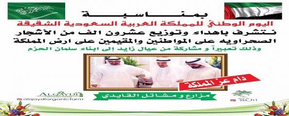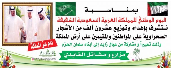 أعلن المواطن الإماراتي سالم سلطان القايدي، عن توزيع 20 ألف شجرة صحراوية على المواطنين السعوديين والمقيمين، وذلك بعد غدٍ الأربعاء (20 سبتمبر 2017م)، في نقاط معينة بالرياض ومدينة الخرج، احتفالا باليوم الوطني (87) للسعودية، وتقديراً لقيادة المملكة والشعب السعودي، واستمرارًا لمبادراتها المتنوعة والمميزة.