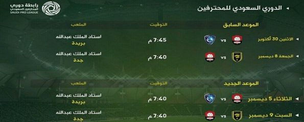 قررت لجنة المسابقات في الاتحاد السعودي لكرة القدم، تعديل مواعيد عدد من مباريات الجولة التاسعة من الدوري السعودي للمحترفين، لتقام على النحو التالي: