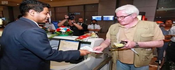 وتقدم المستقبلين رئيس الهيئة العامة للحج والعمرة العراقي الشيخ خالد العطية ونائب السفير السعودي في العراق مشعل العتيبي وعدد من قيادات الطيران المدني العراقي ومطار بغداد الدولي.