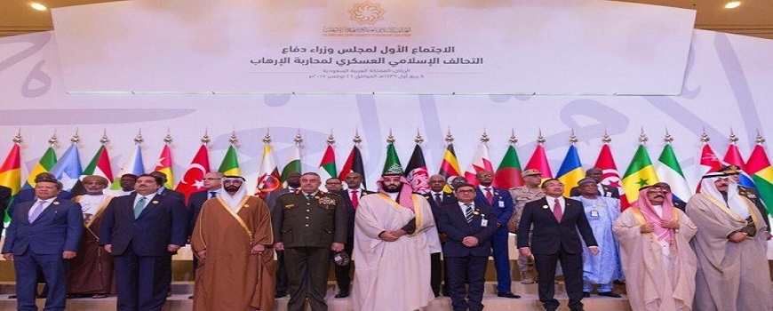 وتعهد الأمير محمد بن سلمان، خلال افتتاحه أعمال الاجتماع الأول لمجلس وزراء دفاع دول التحالف الإسلامي العسكري لمحاربة الإرهاب، تحت شعار (متحالفون ضد الإرهاب)، بفندق الفيصلية بمدينة الرياض، بعدم السماح بتشويه العقيدة السمحة، كما تعهّد بملاحقة الإرهاب حتى يختفي تمامًا.