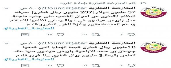 وقالت المعارضة، عبر صفحتها بـ(تويتر): “‏57 مليون دولار؛ أي 207 ملايين ريال صرفها النظام القطري من أموال الشعب على جلب ماجنة مثل باريس هيلتون في دولة يدّعي نظامها الإسلام ودعم المستضعفين وغزة”؛ مشيرة إلى أن قيمة الهدايا التي تقاضتها هيلتون من (جوعان بن حمد) بلغت 10 ملايين؛ منها عقد الماس بقيمة 3 مليون ريال قطري.