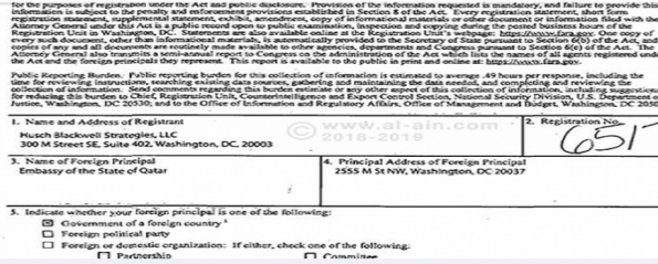 وأبرمت الدوحة رسمياً مطلع فبراير الجاري، تعاقد بين السفارة القطرية بواشنطن وشركة (استراتيجيات هاش بلاكويل)، بتوقيع السفير القطري مشعل بن حمد آل ثاني، نيابةً عن نظام الدوحة، وذلك بحسب سجل وزارة العدل الأمريكية.