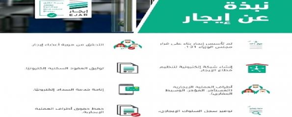 أطلقت وزارتا (الإسكان والعدل)، اليوم الاثنين (12 فبراير 2018م)، بالتعاون مع عدد من الجهات الحكومية (شبكة إيجار الإلكترونية)، التي توفر العديد من الخدمات الإلكترونية لأطراف العملية التأجيرية، كتوثيق العقود، والسداد الإلكتروني، مع إلزام الوسطاء العقاريين كافة في جميع مدن المملكة بتوثيق عقد إيجار الموحد في الشبكة الإلكترونية لخدمات الإيجار، وهو العقد المعتمد بصفته سنداً تنفيذياً.