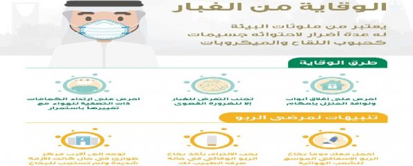 ونشرت (الصحة) أنفوجرافيك توعوي عبر حسابها بـ(تويتر) عن الوقاية من الغبار، حيث أوضحت أن الغبار يعد من ملوثات البيئة، وله عدة أضرار لاحتوائه على جسيمات كحبوب اللقاح والميكروبات.