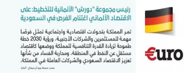 رصد مركز التواصل الحكومي، مواصلة الصحافة العالمية متابعتها للتطورات التي تشهدها المملكة باهتمام بالغ، حيث قال رئيس مجموعة (دورش) الألمانية للتخطيط: “على الاقتصاد الألماني اغتنام الفرص في السعودية”.