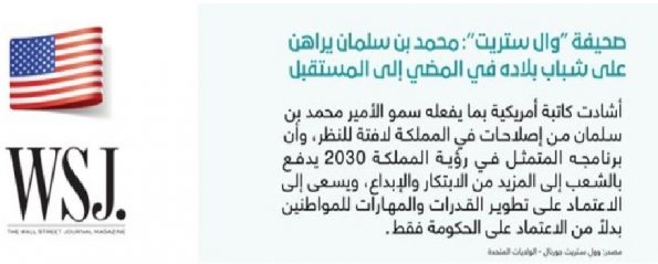 من جهتها، أشادت كاتبة أمريكية بصحيفة (وول ستريت) بما يفعله ولي العهد الأمير محمد بن سلمان، من إصلاحات في المملكة، مؤكدة أن برنامجه المتمثل في رؤية المملكة 2030 يدفع بالشعب إلى المزيد من الابتكار والإبداع ويسعى إلى الاعتماد على تطوير القدرات والمهارات للمواطنين بدلاً من الاعتماد على الحكومة فقط.