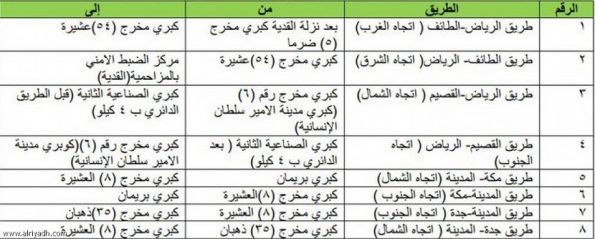 1- طريق الرياض الطائف (اتجاه الغرب) من نزلة القدية كبرى مخرج 5 ضرما إلى كبري مخرج 54 عشيرة.