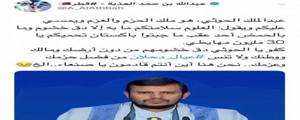 ونشر القحطاني تغريدة كتبها مستشار الديوان الأميري في قطر عبد الله العذبة، يسيء فيها لأبناء المملكة، مستعينًا بكلمات لزعيم ميليشيا الحوثي الإرهابية عبد الملك الحوثي.