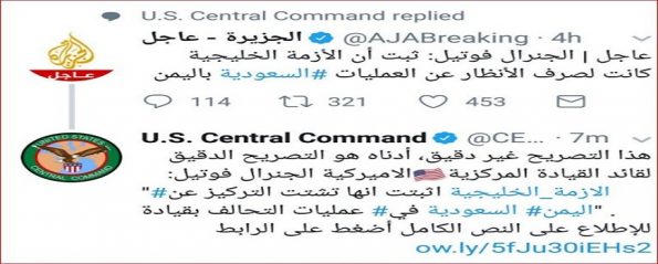 وردت القيادة الأمريكية، على هذا التلفيق، عبر حسابها الرسمي على موقع (تويتر) اليوم الأربعاء (28 فبراير 2018م)، قائلةً:”هذا التصريح غير دقيق، أدناه هو التصريح الدقيق لقائد القيادة المركزية الأميركية”.