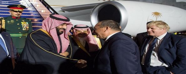 وكان في استقبال ولي العهد، لدى وصوله العاصمة البريطانية لندن وزير الخارجية البريطاني بوريس جونسون والأمير محمد بن نواف بن عبدالعزيز سفير خادم الحرمين الشريفين لدى المملكة المتحدة، والسفير البريطاني لدى المملكة سايمون كوليز.