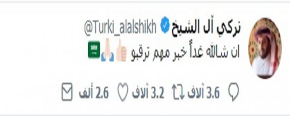 وحصدت تدوينة آل الشيخ، آلاف التغريدات فور إطلاقها، حيث تنافس المغردون، على توقع ذلك الخبر المنتظر.