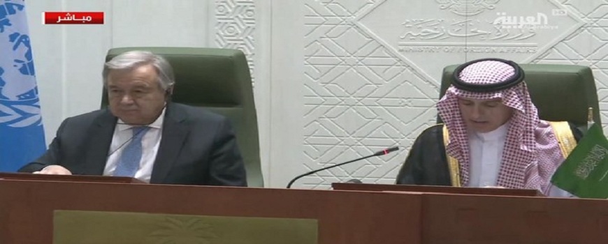 أكد وزير الخارجية عادل الجبير, خلال المؤتمر الصحفي المشترك الذي عقده مع الأمين العام للأمم المتحدة أنطونيو غوتيرس، بمقر وزارة الخارجية بالرياض، اليوم الثلاثاء (17 أبريل 22018م)، أن السعودية من الدول المؤسسة للأمم المتحدة وتقوم بدور ريادي لعلاقتها مع المنظمة والمؤسسات التابعة لها.