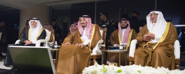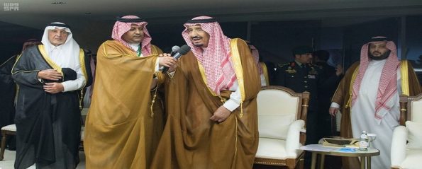 خادم الحرمين الشريفين يؤدي العرضة السعودية خلال حفل المباراة النهائية في الجوهرة.