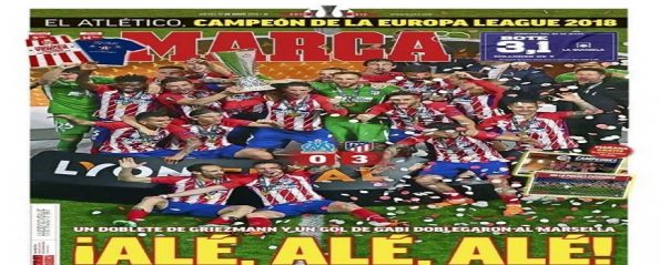 واحتفلت صحيفة (ماركا)، بفوز أتلتيكو مدريد، وقالت: “أتلتيكو بطل الدوري الأوروبي، ثنائية جريزمان وهدف لجابي قضوا على مارسيليا في النهائي”.