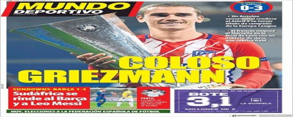 وأما بخصوص نهائي الدوري الأوروبي، عنونت: “جريزمان يتوج أتلتيكو مدريد بالدوري الأوروبي”.