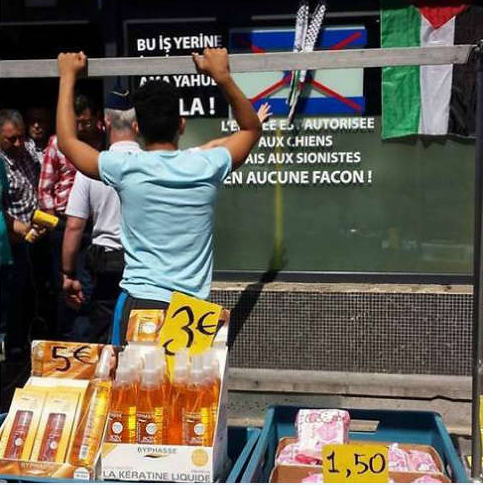 علّق مقهى في بلجيكا لافتة باللغة الفرنسية كتب فيها : «ممنوع دخول الصهاينة تحت أي ظرف.. الكلاب مسموح بهم»، كما وضع لافتة أخرى باللغة التركية بنفس العبارة ولكن وضع كلمة «اليهود» بدلا من «الصهاينة».