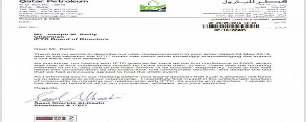 ورد سعد شريدة الكعبي، في 29 مايو الماضي برسالة غاضبة على رئيس مجلس إدارة المؤتمر قائلاً: “لا توجد كلمات يمكن وصف قرار مجلس الإدارة بنقل المؤتمر العالمي رغم إدراكه بتأثير هذا القرار على علاقة شركة قطر للبترول مع الجهة المنظمة للمؤتمر”.