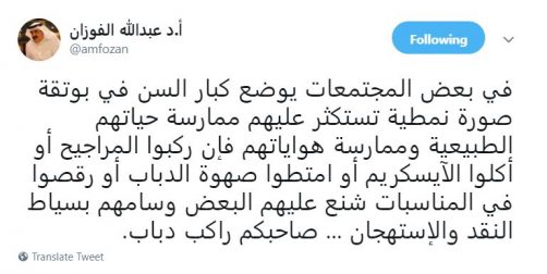 وكتب الفوزان في تغريدة على حسابه بموقع تويتر قائلا “في بعض المجتمعات يوضع كبار السن في بوتقة صورة نمطية تستكثر عليهم ممارسة حياتهم الطبيعية وممارسة هواياتهم”.