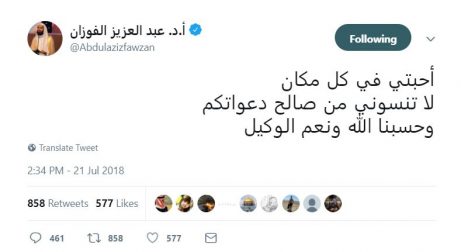 وتوجه الفوزان في تغريدته الجديدة إلى متابعيه قائلا ” أحبتي في كل مكان لا تنسوني من صالح دعواتكم وحسبنا الله ونعم الوكيل”.