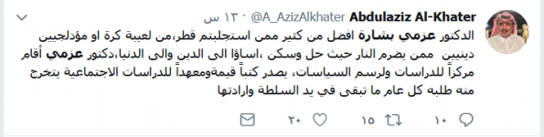 وقال الكاتب عبدالعزيز الخاطر إن “الدكتور عزمي بشارة افضل من كثير ممن استجلبتهم قطر، من لاعبي كرة أو مؤدلجيين دينيين ممن يضرمون النار حيث حلوا وسكنوا”، في إشارة واضحة إلى عناصر جماعة الإخوان المقيمين في الدوحة.