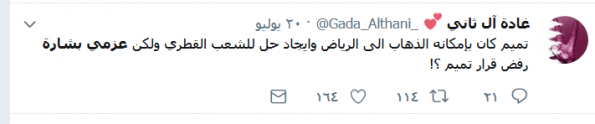 أما غادة آل ثاني، التي تعرف نفسها كمعارضة، فحملت بشارة وقوع قطر في الأزمة الحالية، وذلك بقولها “تميم كان بإمكانه الذهاب الى الرياض وإيجاد حل للشعب القطري ولكن عزمي بشارة رفض قرار تميم ؟!”.