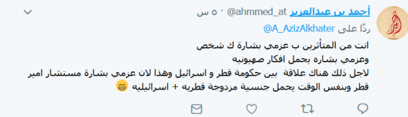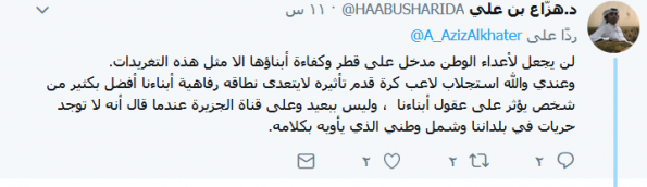 وأضاف:” لن يجعل لأعداء الوطن مدخل على قطر وكفاءة أبنائها الا مثل هذه التغريدات. وعندي والله استجلاب لاعب كرة قدم تأثيره لا يتعدى نطاقه رفاهية أبناءنا أفضل بكثير من شخص يؤثر على عقول أبناءنا ، وليس ببعيد وعلى قناة الجزيرة عندما قال أنه لا توجد حريات في بلداننا وشمل وطني الذي يأويه بكلامه.”