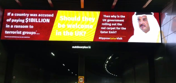وانتشرت عبارة “غير مرحب بك في لندن”، في شوارع العاصمة، كما انتشر هاشتاغ “لندن ترفض زيارة تميم”، وذلك قبل ساعات من زيارة أمير قطر، حيث تسعى المعارضة القطرية من هذا التحرك إلى كشف جرائم وإرهاب النظام القطري أمام الرأي العام البريطاني والأوروبي.