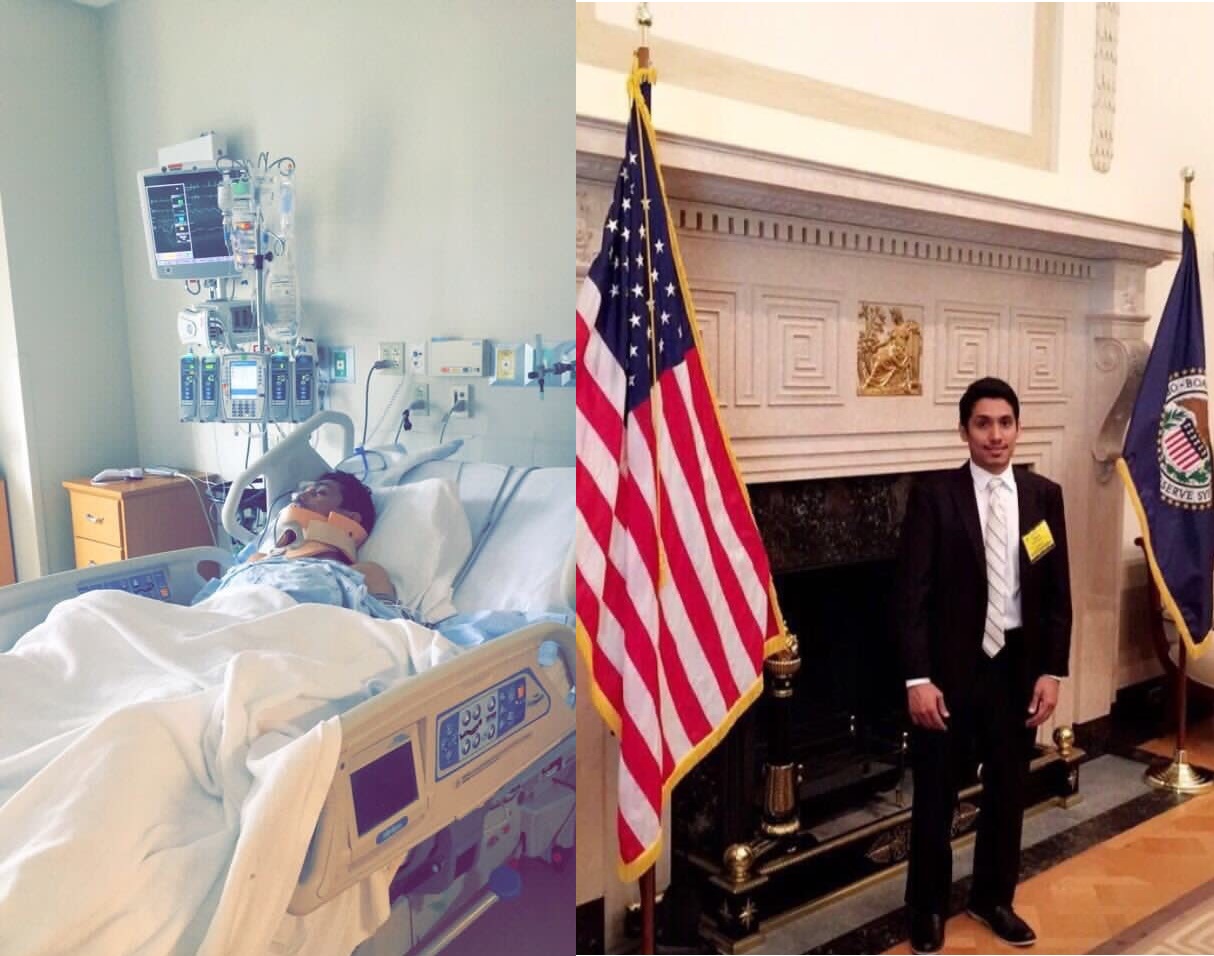 ولا يزال الشاب المبتعث ماجد المزيني يتلقى العلاج في مستشفى جورج واشنطن بالعاصمة الأمريكية بسبب نزيف داخلي.